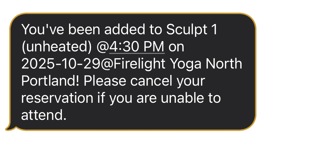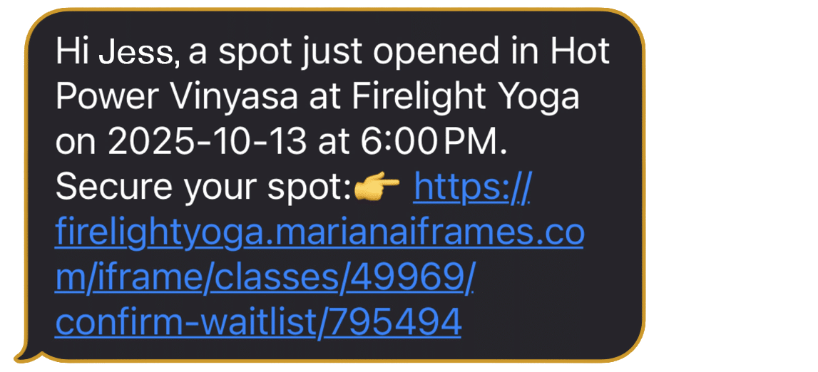 - If a spot opens up and it is outside of the cancellation window, (less than 2 hours before class time, or after 8:00 pm the night before 6:00 am and 7:30 am class reservations,) everyone on the waitlist will receive this text. ACTION IS REQUIRED TO CLAIM THE SPOT. The first person to click the link and accept the open spot, will be moved off the waitlist.
